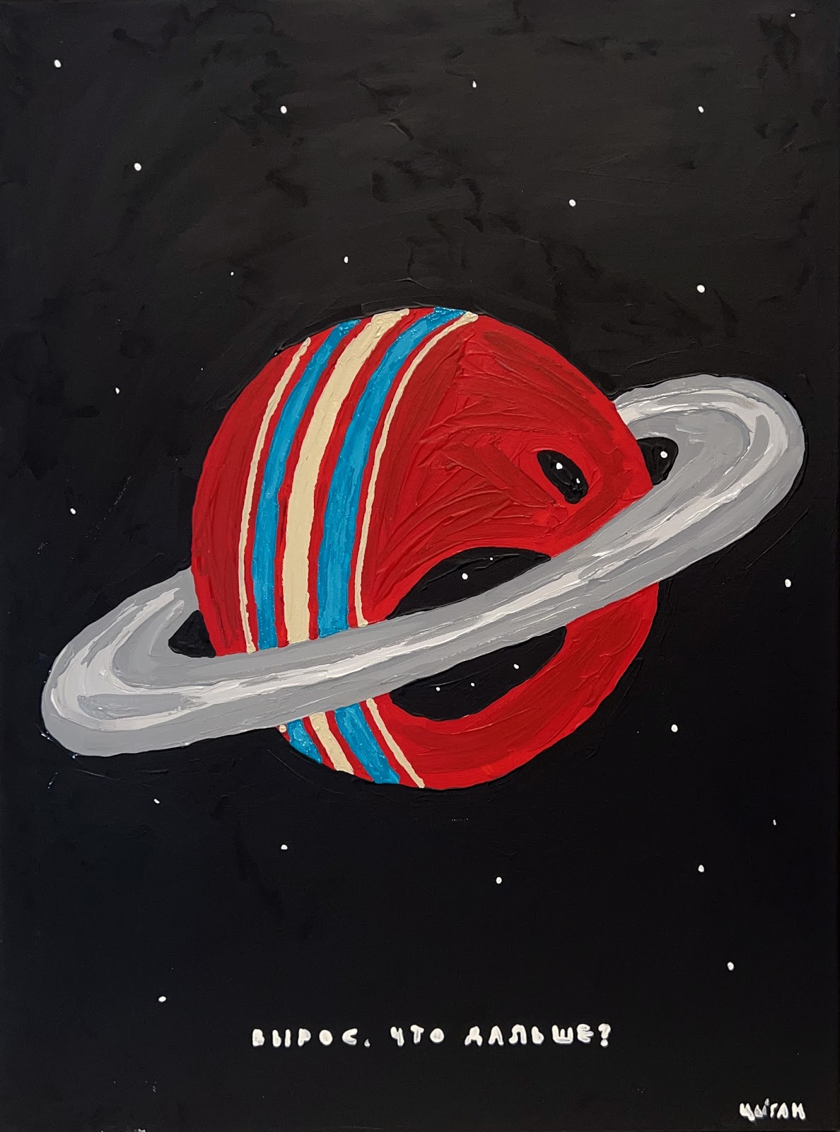 Приевшуюся фразу художник воспринимает всерьез и раздувает привычный объект до планетарного масштаба. Но даже как космическое тело детский мячик не обретает большего смысла: некоторые предметы просто не могут иметь другого значения помимо своей понятной функции. Они остаются вспомогательными элементами взросления, как игрушки или как предупреждения о возможных ошибках – и то и другое со временем перестает играть заданную роль. Работа выполнена эксклюзивно для нашего аукциона Эстимейт: 30 000 - 40 000