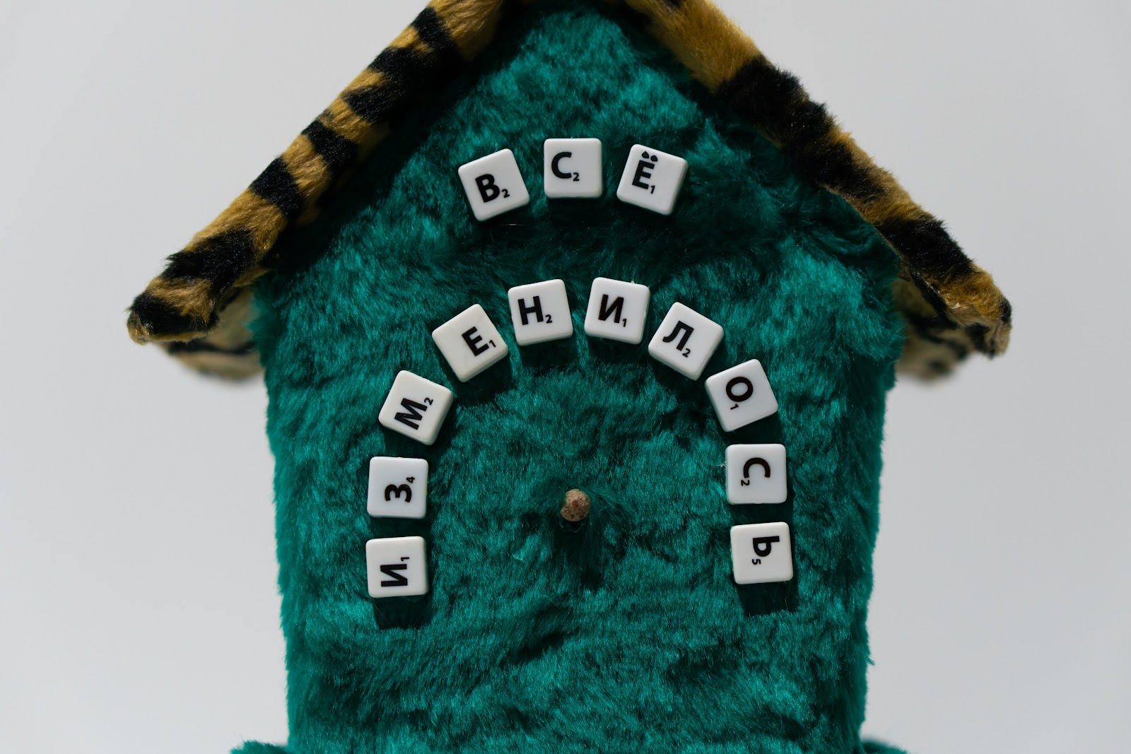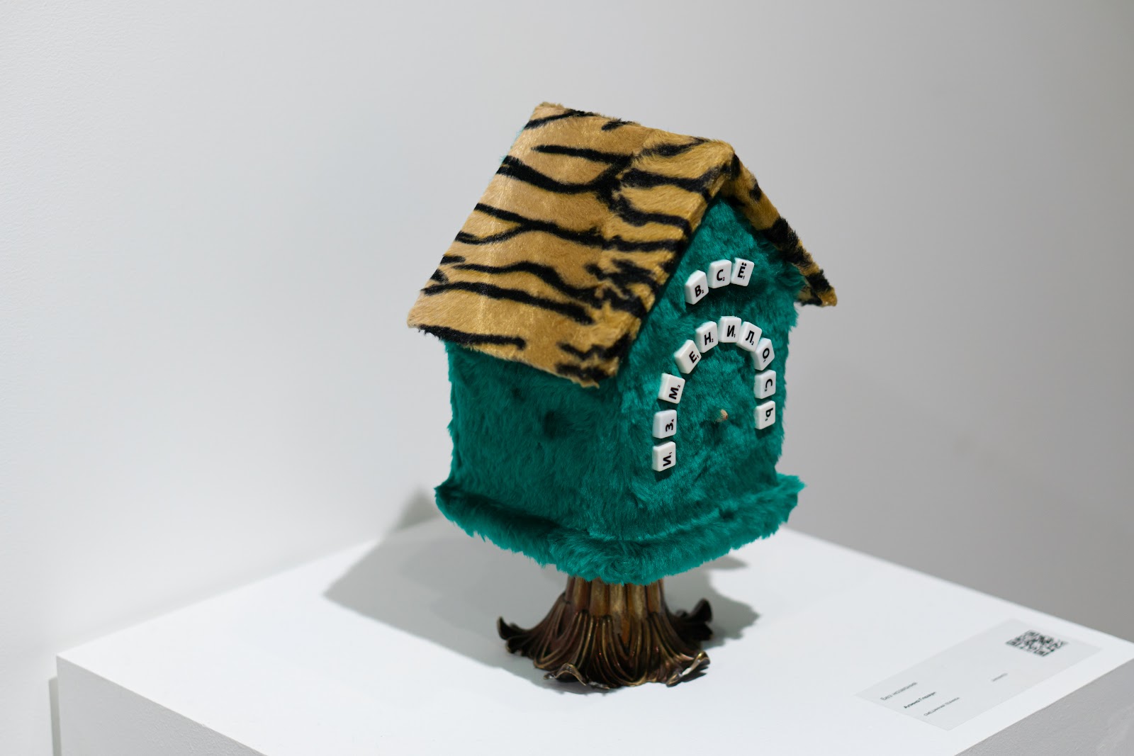 Как бы не оправдывался художник о ненамеренности смысла в своих работах, некоторые объекты несут в себе очень понятные универсальные образы. Здесь домик на курьих ножках читается даже в пушистом тигровом облачении. Получая свою долю реновации, сказочная недвижимость напоминает нам о новой реальности. Твёрдое «Все изменилось» вряд ли сможет оставить кого-то равнодушным: оглядываясь всего на два слова, каждый сможет восстановить полную картину из личных перемен. Выставленные в ровных буквах на тактильно-приятном материале даже самые прямолинейные посылы сначала становятся визуально приятными, чтобы затем стать указателем для размышлений и обрести новую трактовку. Работа предоставлена Myth Gallery Эстимейт: 60 000 - 70 000 р.