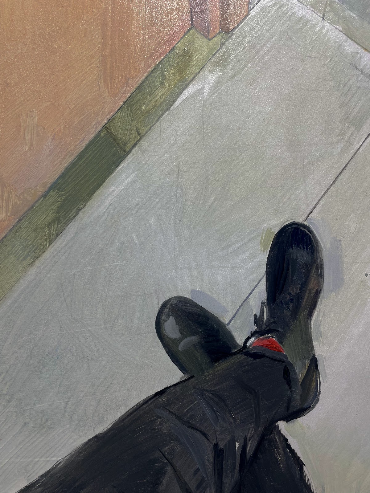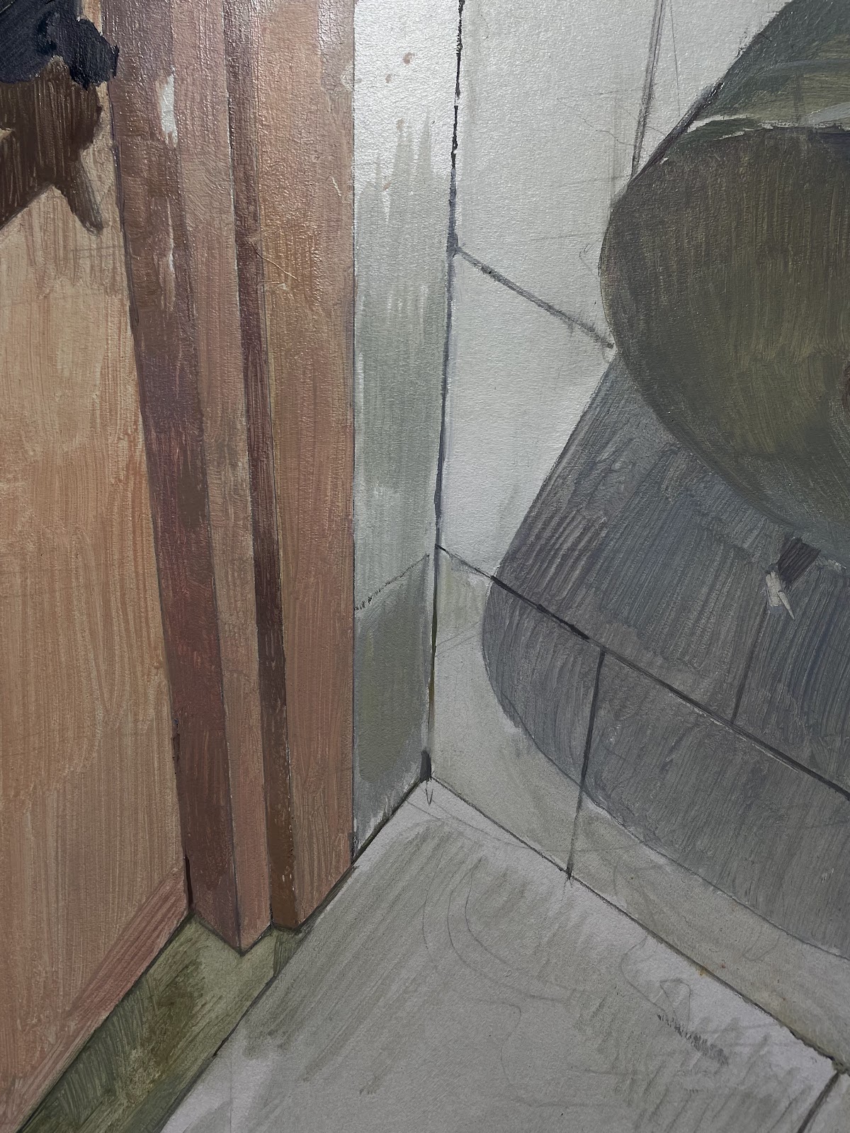Холодная плитка кабинки, голоса за тонкой дверью и ощущение паузы. Ограничивая живописную композицию словно кадром цифровой фотографии, художница показывает момент уединения от первого лица. Универсальные для большинства общественных пространств туалетные кабины становятся своеобразным местом исключения из кипящих жизнью мест встречи. Кажется, именно поэтому эти незначительные детали и непримечательные уголки врезаются в память. Главным объектом полотна в этом случае стала розовая дверь, как вещь спасенная из потока памяти своим цветом. Расставляя друг против друга детали, художница добивается от повседневности сюрреализма. Работа предоставлена 3120 Gallery Эстимейт: 100 000 - 110 000 р.